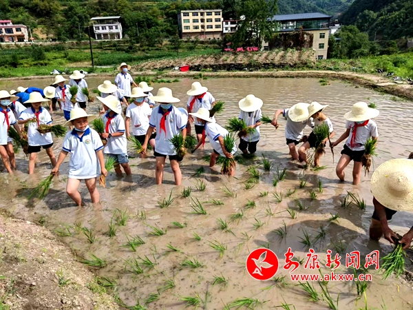本网讯(通讯员 牟枫 刘成军)6月7日,紫阳县高桥镇中心小学392名学生在老师的带领下,伴随着初夏气息,嗅着扑鼻的泥土芳香,整齐有序地来到该县梦紫阳中小学劳动实践基地,开展“知农事,学农耕,惜农食”插秧劳动实践活动。