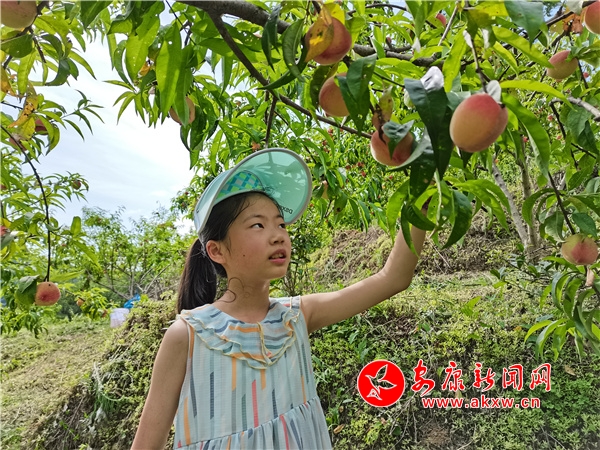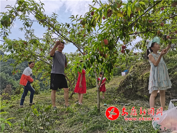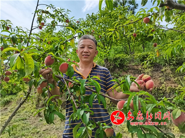 “当下正是蜜桃的最佳采摘期,我们这里生态好,植被覆盖率高、水资源丰富,气候适宜,在这样自然条件下生长出来的果子是纯天然、无污染、原生态的。你看,这些果子颗颗饱满,个头均匀,肉厚核小,口感香甜多汁,且采摘持续时间长,可以采摘到七月下旬”。为了让大家吃到品质好的桃,我和妻子参加了镇农综站牵头的种植、养殖培训,在他们的指导下熟练的掌握了种养技术。通过控制挂果密度让每个果子充分享受阳光和养分,这样才能结出又甜又好的果子。”种植大户胡小飞介绍说。