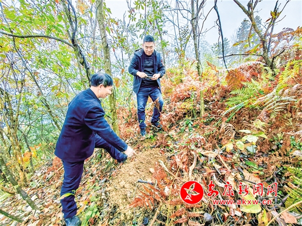 郭光均(左)在查看林下种植的天麻。