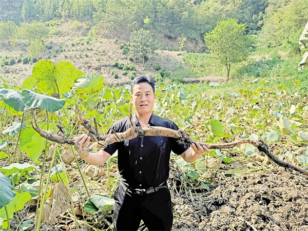 蒿坪镇王家河村莲藕喜获丰收,包村干部为莲藕作宣传。 刘姝含 摄