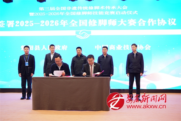 签约与启动仪式上,紫阳县人民政府与中国商业技师协会签署2025—2026年全国修脚师大赛合作协议,并共同启动大赛。紫阳县人社局与扬州市陆琴脚艺职业培训学校签订修脚技能培训协议;现场还举行了会旗交接仪式,确定了下一届承办单位。