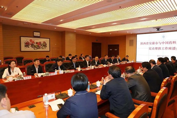 在随后召开的座谈会上,郭青对中国药科大学为我市打赢脱贫攻坚战给予的鼎力支持和倾心帮扶表示由衷感谢。他指出,安康将认真贯彻习近平总书记关于深化东西部协作和定点帮扶工作的重要指示,抢抓五年过渡期政策机遇,着力巩固拓展脱贫攻坚成果,接续推进乡村振兴,扎实推动经济社会高质量发展。诚挚希望中国药科大学将帮扶镇坪县的成熟经验向我市紫阳、平利、宁陕等县拓展,在技术培训、资源普查、基地建设、品牌宣传、人才培养等方面给予更多支持,推动安康全域中药材产业发展迈上新台阶,助力安康谱写新时代追赶超越新篇章。