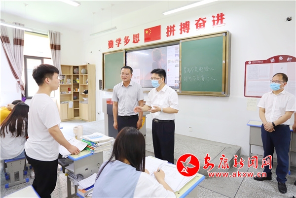 在汉滨高中, 寇全安一行先后检查了入校检测点、防疫物资储备、监控平台运行等,了解考点参考人数、考场布置,以及食品安全、试卷保密等备考保障措施落实情况,叮嘱要压实各方责任,加强统筹配合,为广大考生营造安全安静、舒适舒心的考试环境。在江北高中和汉阴县第二中学,他走进教室和高考学子交谈,勉励他们保持良好心态,从容备考应考,并祝福考生取得优异成绩;还着重了解了学校心理咨询室运行情况,并就如何开展心理健康教育和预防校园暴力与校长、部分教师进行了交流探讨。