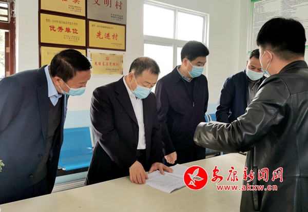 市长武文罡(左二)在岚皋县民主镇新喜村村委会检查脱贫攻坚成果巩固情况