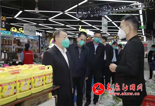 武文罡一行在紫阳县城关镇会仙桥社区万友超市检查生活物资供应情况。记者 吴单 摄