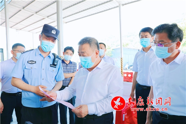 在城关镇下卡子省际疫情防控卡点,武文罡详细了解防控流程、交通查验等情况,对坚守一线的防疫人员表示慰问和感谢。他强调,当前我市疫情防控工作总体平稳,但国内疫情形势依然严峻复杂,要紧绷思想之弦,杜绝麻痹大意,加强值班值守,耐心细致做好来返人员扫码登记、验码测温、48小时内核酸检测阴性证明查验、风险人员“点对点”转运等工作,坚决守住外防输入第一道关口。在下卡子省际水质监测站,武文罡强调,要采取有力举措加强流域综合治理,强化源头把控监测,确保出陕断面水质持续向好、稳定达标。