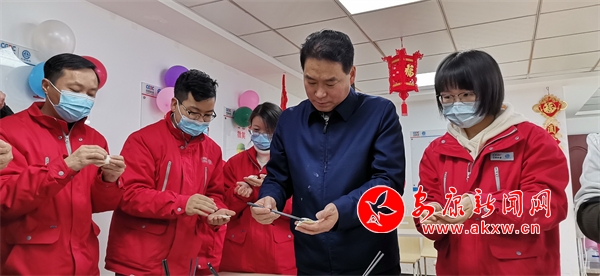 随后,赵俊民来到项目部职工食堂,与大家一起包饺子吃团年饭,其乐融融迎新年。