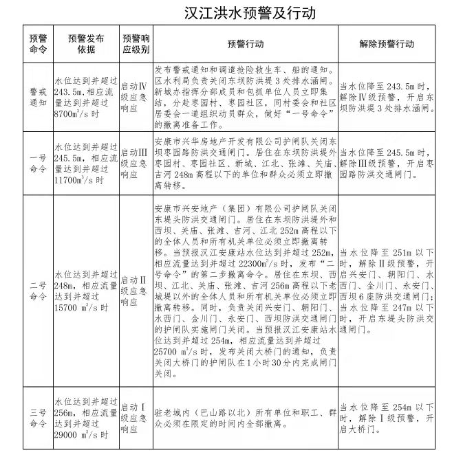 根据《安康市人民政府关于印发安康城区防汛抗洪预案的通知》有关汉江洪水预警及行动的内容: