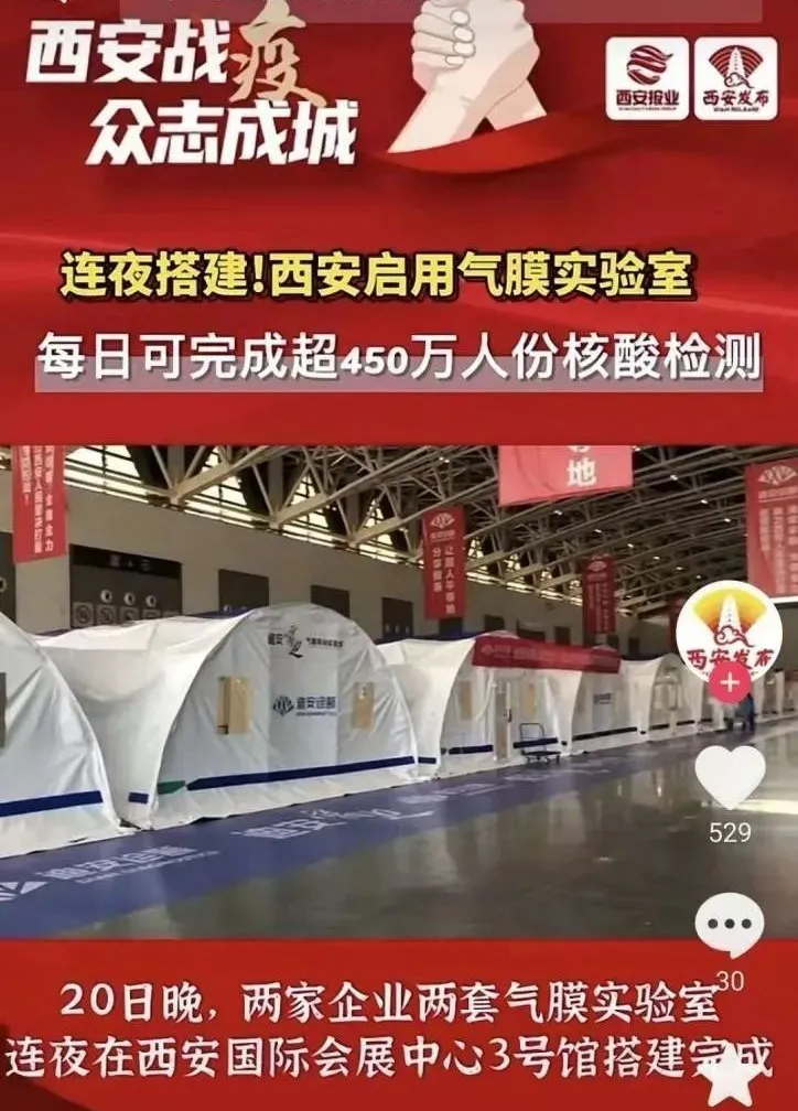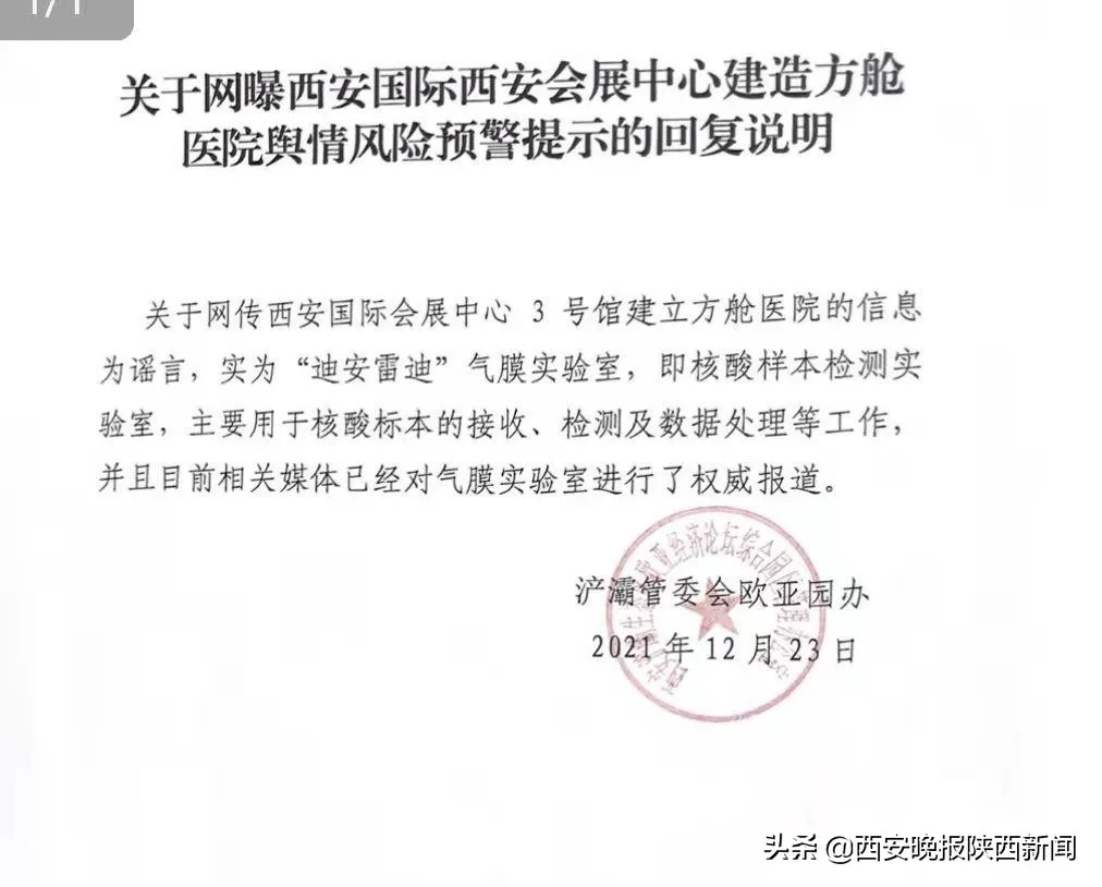 近日,短视频平台有网民发视频称“西安国际会展中心正在建方舱医院”,经核实,该信息为谣言,实为“迪安雷迪”气膜实验室,用于核酸检测工作。