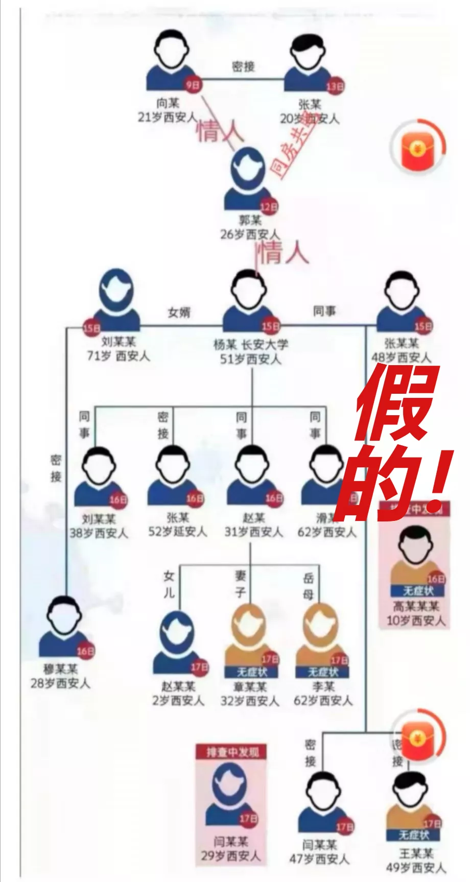网上流传一张确认病例传播链分解图,在病例之间标注“情人”关系,并传言此次疫情传播因素之一,是因为西安首例病例与子牛门诊的护士为情人关系,导致疫情扩散,经核实,该图盗用华商网12月18日制作的新闻作品图片。该信息为虚假信息,造谣的人已被拘留。