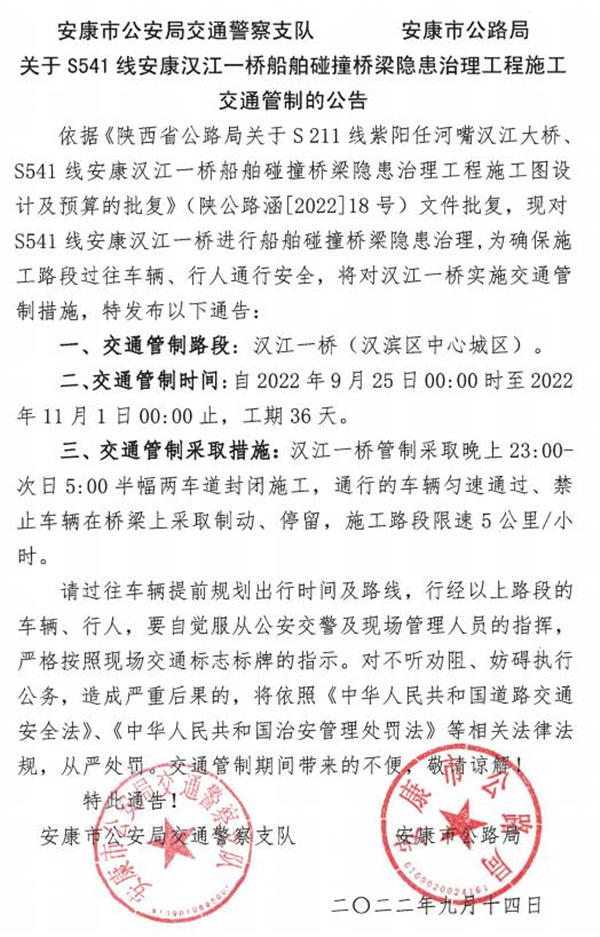 9月25日至11月1日安康汉江一桥将进行船舶碰撞桥梁隐患治理工程施工,将对汉江一桥实行交通管制36天,管制采取晚上23:00-次日5:00半幅两车道封闭施工,通行的车辆匀速通过,禁止车辆在桥梁上采取制动、停留,施工路段限速5公里/小时。qmU安康新闻网