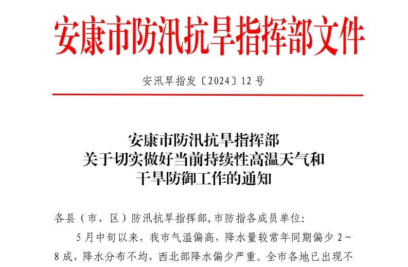 6月12日,安康市防汛抗旱指挥部发布《关于切实做好当前持续性高温天气和干旱防御工作的通知》。
