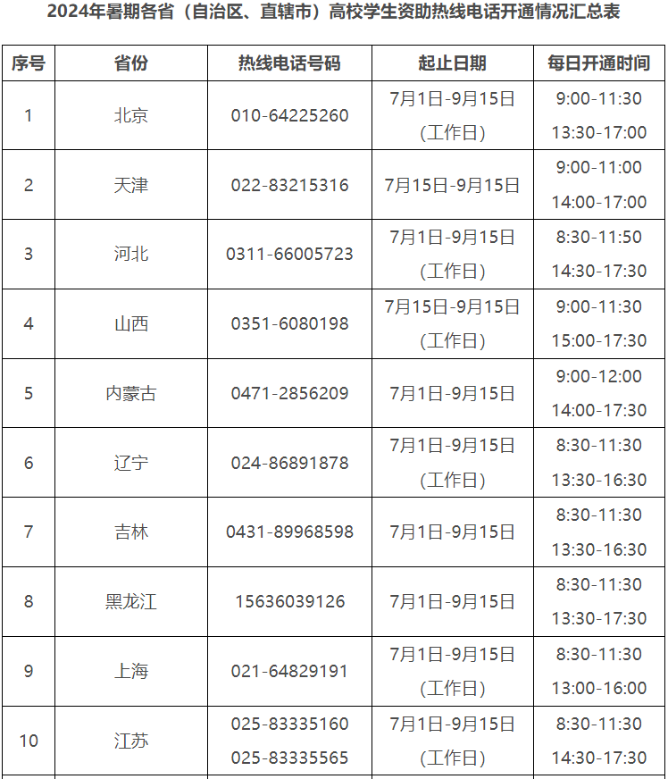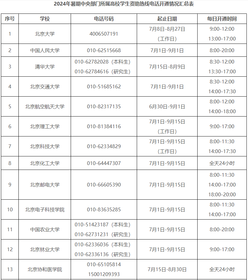 今年暑期,教育部将继续开通高校学生资助热线电话,号码为010—66097980、010—66096590,受理时间为7月1日—9月15日,每天8:00—20:00,为大学新生特别是家庭经济困难的大学新生提供资助政策咨询与帮助。