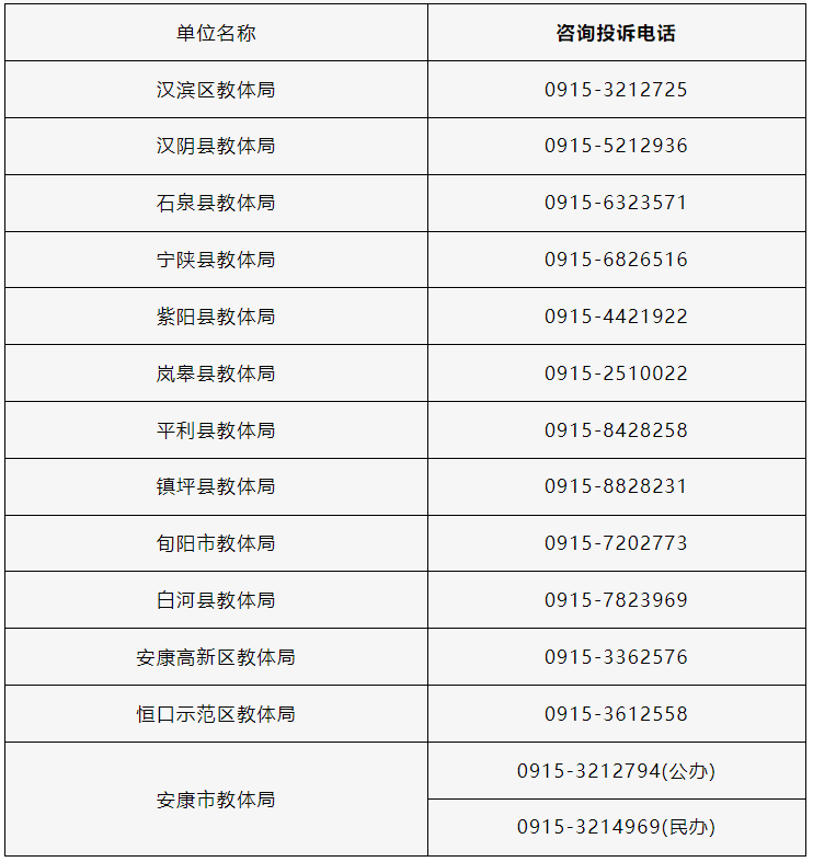 附件2:2024年安康市义务教育招生入学工作咨询投诉电话