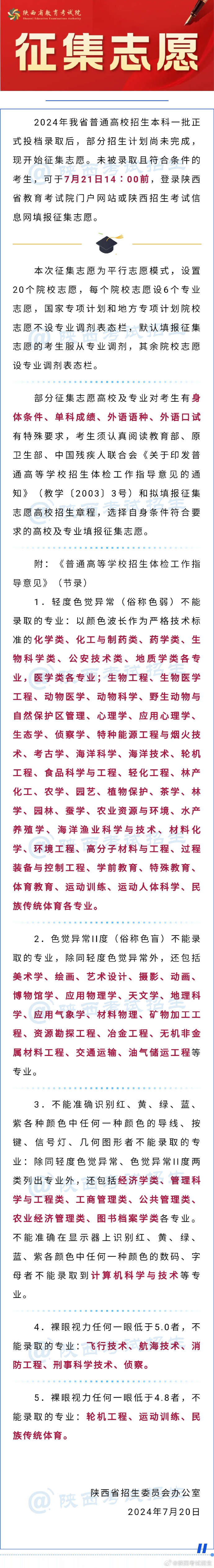 2024年我省普通高校招生本科一批正式投档录取后,部分招生计划尚未完成,现开始征集志愿。未被录取且符合条件的考生,可于7月21日14∶00前,登录陕西省教育考试院门户网站或陕西招生考试信息网填报征集志愿。F2b安康新闻网