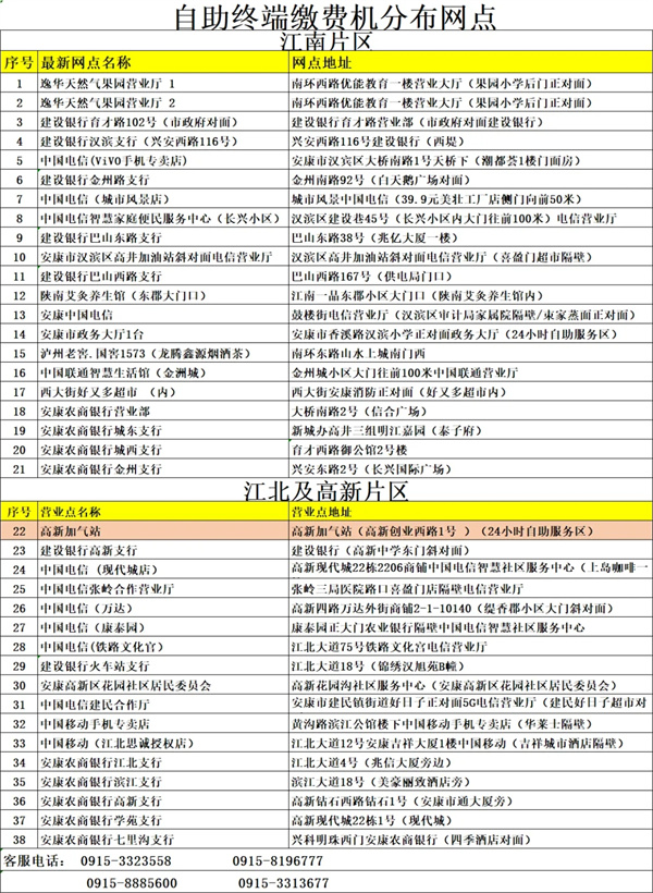 为进一步方便广大用户购买天然气,我公司在电信营业厅、建设银行、农商银行及便民服务点等网点布设38台天然气自助终端缴费机。现温馨提示您关注“安康市逸华天然气有限公司”微信公众号查看自助机分布网点,选择就近网点进行天然气充值。其他业务可在工作时间内前往以下人工服务大厅或窗口办理,部分业务也可通过微信公众号的“微营业厅”办理: