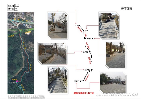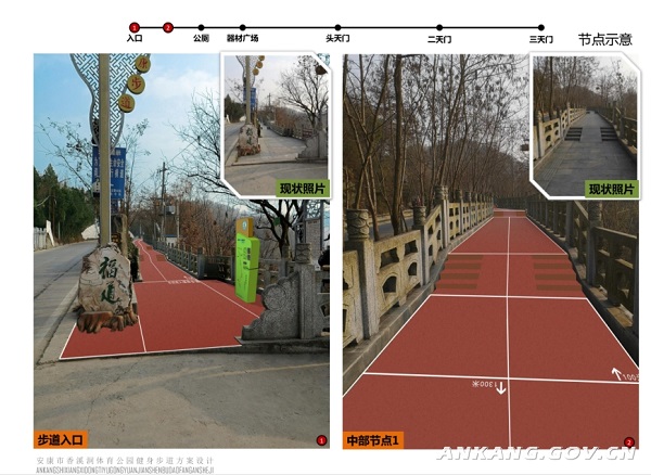 项目实施地点为安康市香溪洞风景区原有健身步道(水泥路面),北起香溪文化广场南侧,南至香溪洞景区停车场,全长约1.5公里,宽度介于2.47—3.72米之间。