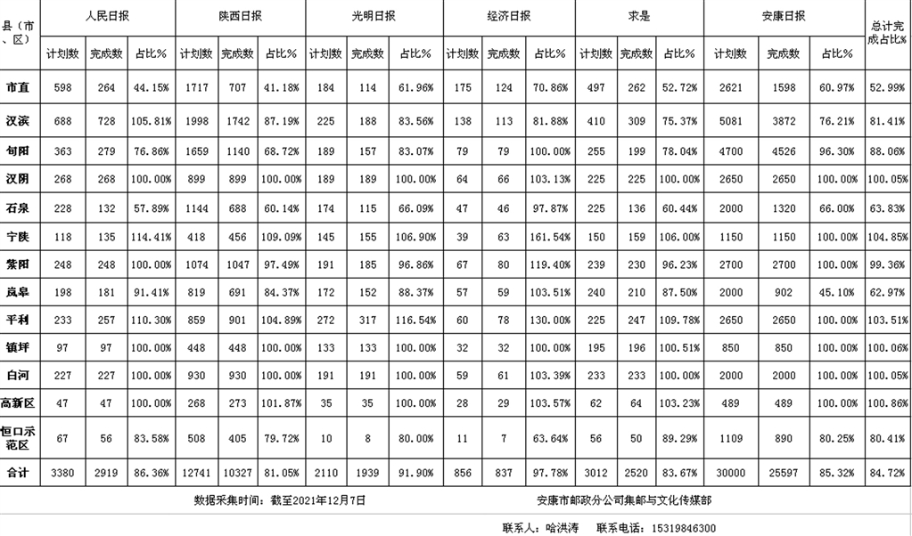 截至2021年12月7日,全市重点党报党刊完成量占下达计划数的84.72%。征订情况为:宁陕县104.85%,平利县103.51%,高新区100.86%,镇坪县100.06%,汉阴县100.05%,白河县100.05%,紫阳县99.36%,旬阳市88.06%,汉滨区81.41%,恒口示范区80.41%,岚皋县62.97%,市直各单位52.99%。其中,宁陕县、平利县、高新区、镇坪县、汉阴县、白河县,措施有力,率先完成2022年度征订任务。