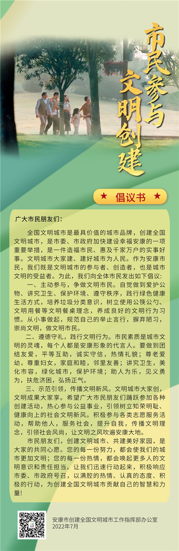 三、示范引领,传播文明新风。文明城市大家创,文明成果大家享。希望广大市民朋友们踊跃参加各种创建活动,热心参与公益事业,引领树立知荣明耻、健康向上的社会文明新风。积极参与各类志愿服务活动,帮助他人,服务社会,提升自我,传播文明理念,引领社会风尚,让文明之风吹遍安康大地。