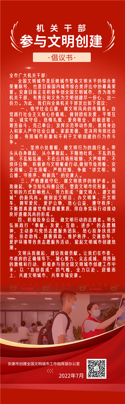 全国文明城市是反映城市整体文明水平的综合类荣誉称号,也是目前国内城市综合类评比中的最高荣誉。安康目前正在积极争创全国文明城市,作为我市机关干部,有责任和义务为文明创建尽一份心、出一份力。为此,我们向全体机关干部发出如下倡议: