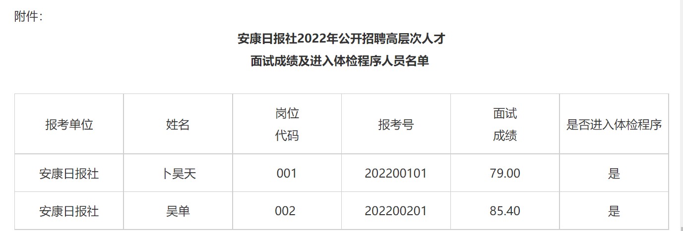 根据《安康日报社2022年公开招聘高层次人才公告》规定,现将安康日报社2022年公开招聘高层次人才面试成绩及进入体检程序人员名单(见附件)、体检有关事项,公告如下: