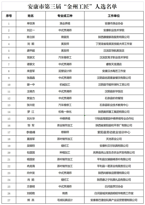 根据市委组织部、市总工会、市人社局《关于开展第三届“金州工匠”评选活动的通知》(安人社函〔2022〕243号)和《安康市“金州工匠”评定办法》,经申报、评审并征求有关部门意见,拟评选安康市渔业协会单世涛等27人为安康市第三届“金州工匠”,现予公示,公示期自2023年3月28日至2023年4月3日。