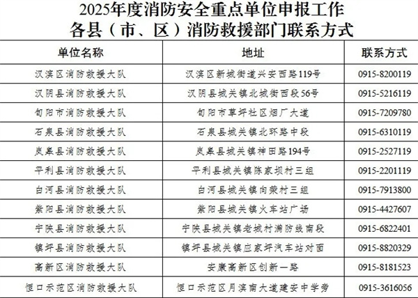 为进一步规范全市消防安全重点单位的监督管理工作,推动单位落实消防安全主体责任,根据《中华人民共和国消防法》《陕西省消防条例》《机关、团体、企业、事业单位消防安全管理规定》《陕西省消防安全重点单位界定标准》等法律法规的有关规定,按照“应列尽列”的标准,凡符合下列界定标准的单位,应主动向当地消防救援部门申报,经审查核定后,确定为消防安全重点单位,现将申报2025年度消防安全重点单位工作公告如下: