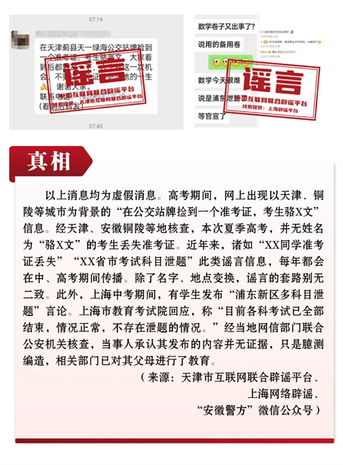 谣言7:天津、安徽等地考生“骆X文”丢失准考证?上海浦东新区中考多科目泄题?