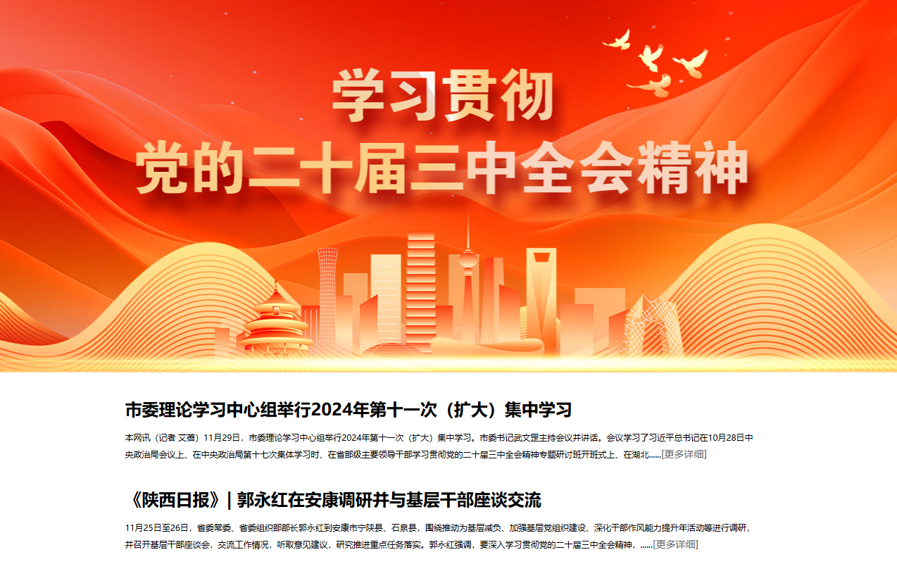 安康新闻网始终把学习宣传贯彻习近平新时代中国特色社会主义思想作为首要政治任务,聚焦全市发展大局,开展重点工作主题宣传。2024年安康新闻网紧扣中省重大部署和市委、市政府重点工作,突出中心,着眼大局,全年相继开设“安康两会”“党纪学习教育”“学习贯彻党的二十届三中全会精神”“孝义善举”“锚定现代化 改革再深化”“热烈庆祝中华人民共和国成立75周年”“南水北调中线工程通水十周年”等38个新闻专题,推送专题稿件3800余篇。