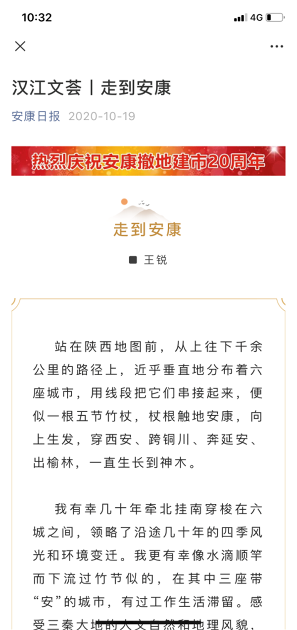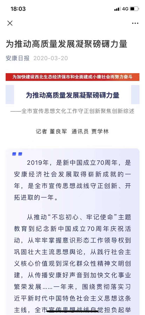 积极践行和弘扬“四个自信”,在安康日报微信公众号发布地方发展各行业多角度综述文章、深度评论,以及干部职工干事创业的典范事迹。《为推动高质量发展凝聚磅礴力量》《“担当作为”“干事创业”……这些荣誉他们值得》《后浪推着前浪走,青年推着时代走》等作品,全面展现国家富强、人民幸福和社会和谐的中国梦图景。