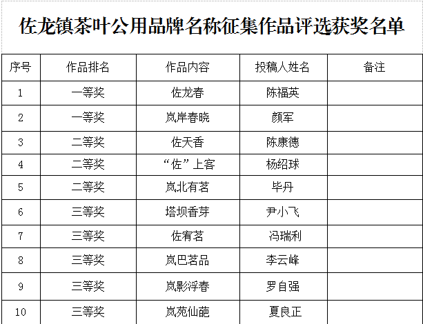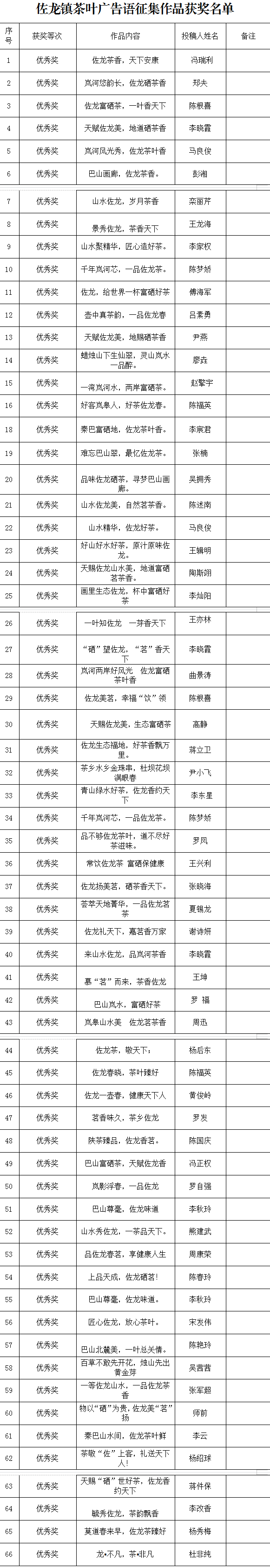 岚皋县佐龙镇党委、镇政府在安康日报、安康新闻网发布《佐龙镇有奖征集茶叶公用品牌名称及广告语公告》以来,得到社会各界人士的积极响应和支持。本次收集到的所有作品,佐龙镇安排专人逐一按时间顺序统一排序备选,经组委初选、专家评选,已评选出获奖作品拟予以奖励,现将拟获奖名单进行公示,其中一等奖2名,二等奖3名,三等奖5名,优秀奖66名,公示时间自发布之日起至2021年12月31日17时。拟获奖名单如下: