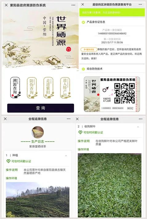 紫阳县建立了紫阳茶溯源系统,利用区块链、一品一码等技术,为紫阳茶制作独一无二的溯源档案,生成唯一的溯源二维码,通过手机扫描产品包装上的二维码,即可快速通过图片、实时监控视频等方式,查看紫阳茶从茶园、生产加工、检测等全程溯源档案信息。