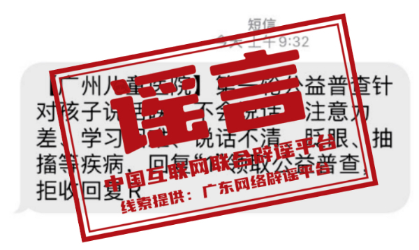 真相:近期,有社会医疗机构冒用广州市妇女儿童医疗中心(以下简称“广州妇儿中心”)名称,通过群发短信的方式,宣传该中心正在进行“身高普查”“针对孩子说话晚,不会说话、注意力差等”等公益普查项目。对此,广州妇儿中心发布声明称,目前,该中心未就上述公益普查项目与其他任何医疗机构或社会组织存在合作关系,也未曾通过短信、电话向广大患者推送过医疗信息。特此提醒广大市民,切勿轻信此类信息,并注意保护个人隐私。(来源:广东省互联网举报中心)