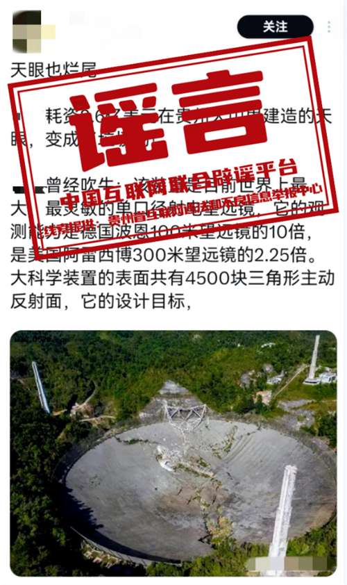 真相:近日,海外社交平台有网民发布一张图片,声称“耗资2.6亿美元在贵州大山里建造的天眼,变成了垃圾场!”对此,“贵州辟谣”官方微信公众号发布消息称,网传说法为谣传,网传图片实为美国波多黎各的阿雷西博天文台(Arecibo Observatory)于2020年12月发生彻底坍塌的画面,该天文台主要的观测装置为阿雷西博射电望远镜。事实上,这并非“中国天眼”第一次“被坍塌”,2020年阿雷西博望远镜第一次出现严重损坏之际,网络中就曾出现过类似谣言。