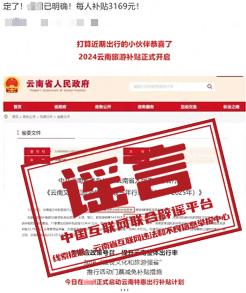 谣言:去云南旅游每人补贴3169元?