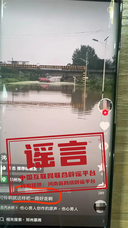 7月15日,网民“神x”在某短视频平台发布“货车司机被淹”视频,并配文称“可怜啊,就这样吧,一路好走”。经核实,7月14日,邓州市铁路桥下一外地牌照货车被淹,车内被困人员已被成功救出,无人员伤亡,该信息与事实严重不符,系虚假信息。
