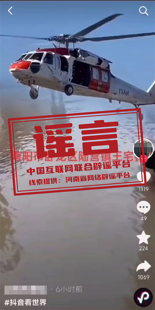 7月15日,网民“宾利xx”在某短视频平台发布视频称“南阳市卧龙区陆营镇王庄村被水淹,卧龙区使用直升机进行救援”。经核实,卧龙区未使用直升机进行救援,视频是发布者使用软件拼接而成,系虚假信息。