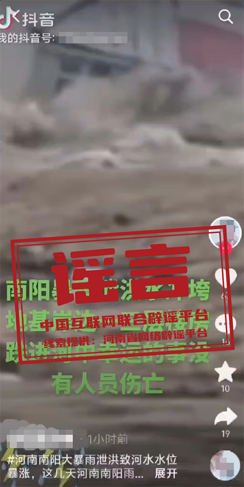 7月15日,网民“忆思xx”在某短视频平台发布视频称“南阳暴雨泄洪,水冲垮地基,岸边一三层楼房跌进河中,幸运的是没有人员伤亡”。经核实,南阳此次暴雨未发生房屋被冲塌事件,该视频为2021年某地暴雨泄洪,致河水水位上涨,岸边3层楼房轰然倒塌视频,并非近日发生的汛情。