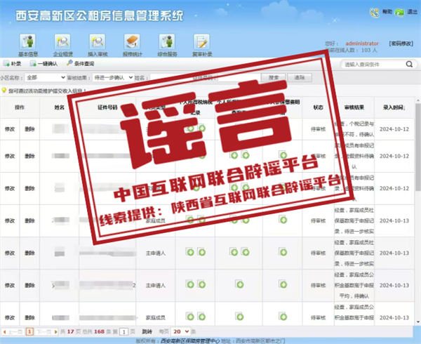 真相:近期,有不法分子伪造西安高新区公租房信息管理系统审核界面,在网络上散布公租房资格审核虚假信息,引发关注。对此,西安高新区住房和城乡建设局发布《关于警惕不法分子伪造虚假信息的声明》称,切勿轻信网络、微信中发布的高新区公租房相关政策虚假信息及类似委托代办信息,以避免个人经济、财产受到损失。高新区公租房资格审核全程不代办、不收费,审核结果均以市级六部门联审反馈结果为准。同时,任何通过违规代办以及提供虚假材料骗取公租房资格的,一经发现,将严肃查处,取消保障资格。(来源:陕西省互联网联合辟谣平台)