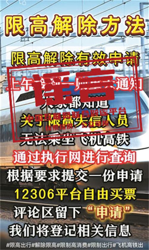 真相:近日,一些短视频平台频现所谓“限高令新政”信息,宣称“有内部途径,被限制高消费人员不用还款也能正常买机票、高铁票”,引发关注。对此,最高人民法院执行局相关负责人表示,关于“新政”一说实属谣言。各级人民法院从未出台过解除限制消费措施,或为不偿还债务的限高人员提供长期“解限”的相关规定。网上关于对不履行生效法律文书确定义务的被执行人解除限制消费措施等内容均为不实信息。(来源:北京青年报)