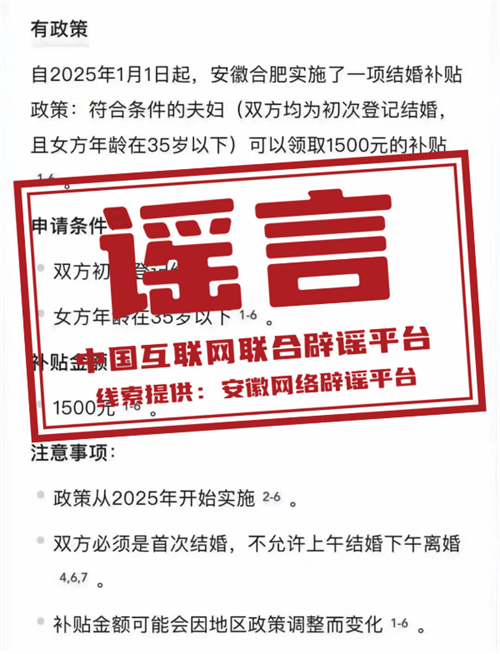 真相:近日,有网民发布消息称“自2025年1月1日起,安徽合肥实施结婚补贴政策”“初次结婚登记可以领取1500元补贴”“下载相关APP即可领补贴款”,引发关注。对此,合肥市民政局发布声明称,网传消息为谣言。合肥市并未研究、出台有关结婚登记的补贴政策,望广大网民注意甄别。(来源:“安徽省互联网违法和不良信息举报”微信公众号)