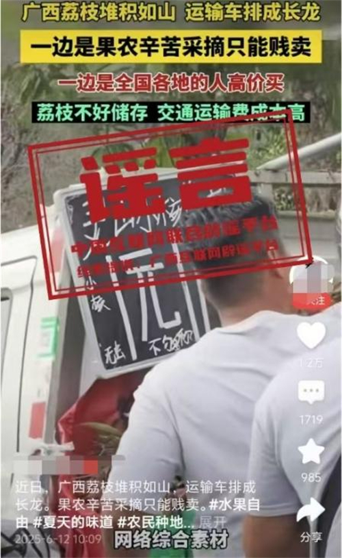 真相:6月12日,网传“近日广西荔枝堆积如山,运输车排成长龙。果农辛苦采摘只能贱卖”的视频,画面显示荔枝堆积和“灵山荔枝1元”字样。经核查,视频内容并非发生在灵山县。目前,灵山荔枝“妃子笑”等中熟品种逐渐批量上市,大规模上市时间为6月20日左右,当前荔枝产销有序开展,并未发现个别媒体报道的“荔枝滞销贱卖”“采摘堆积成山”“运输车排成长龙”的情况,也没有发现价格低到1元的荔枝出售。(来源:“广西互联网违法和不良信息举报”微信公众号)