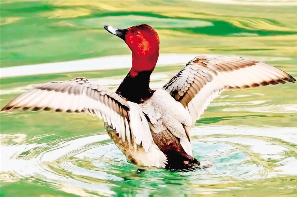 又名红头鸭,矶凫。雄鸟头部栗红色,胸部黑色,背部及腹部灰白色,尾黑色,嘴蓝灰色且端部黑色;雌鸟头部及胸部暗褐色,背部及腹部灰色,尾部褐色,嘴基部色浅。红头潜鸭虹膜雄鸟红色,雌鸟灰褐色,脚黑色。(来源:安康市林学会)FSQ安康新闻网