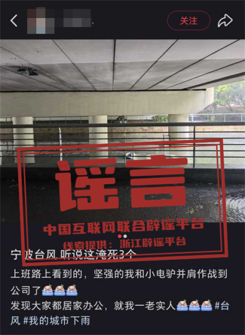 真相:7月30日9时许,某社交平台网民沈某(女,23岁,宁波鄞州人)发帖造谣称“宁波一涵洞内车辆被淹,有3人淹死”。经核查,该内容系谣言,目前公安机关已对沈某依法予以批评教育,该帖文现已删除。