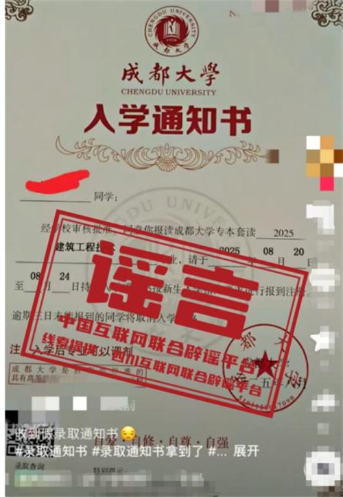 详情:近日,有考生在网络社交平台发帖称,未在高考志愿中填报“成都大学”,却收到了所谓该校的“专本套读入学通知书”,引起关注。8月19日,成都大学发布严正声明称:从未开展“专本套读”形式的学历教育招生,任何以“专本套读”“自考全日制本科”等名义发放的所谓“入学通知书”均系伪造,其所宣称的“入学后可调剂专业”与成都大学招生政策完全不符。