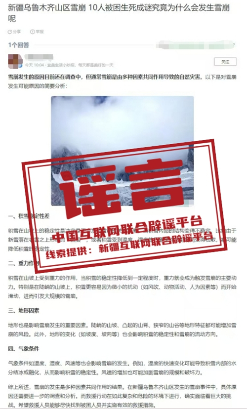 谣言:乌鲁木齐山区发生雪崩,10人被困生死成谜?