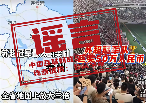 辟谣:地图放大三个字号?奖金五十万?这些网传苏超冠军队奖励都是假的!