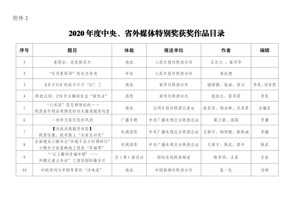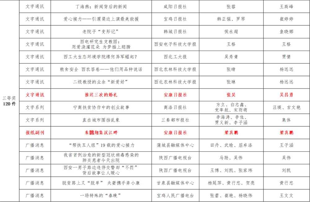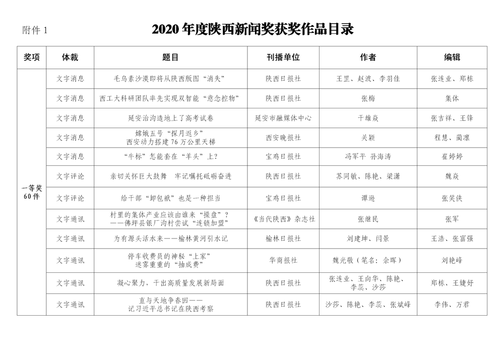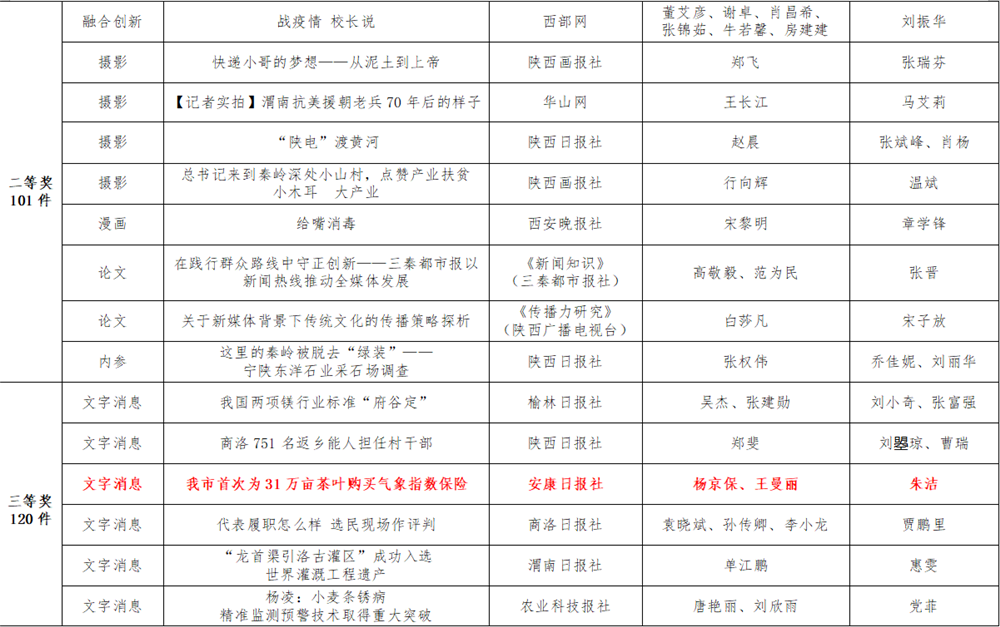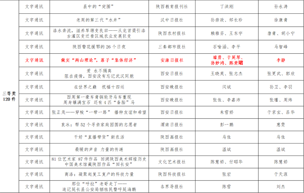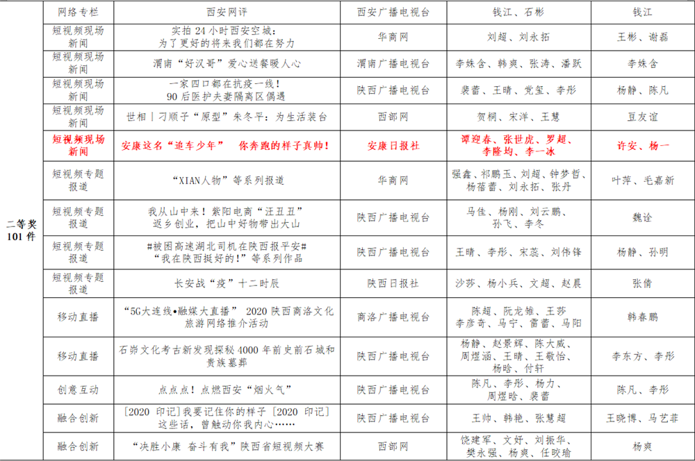 7月6日,陕西省新闻工作者协会公布了2020年度陕西新闻奖、陕西省优秀新闻工作者评选结果,最终评定2020年度陕西新闻奖获奖作品281件,其中一等奖作品60件、二等奖作品101件、三等奖作品120件;10件作品获2020年度陕西新闻奖“中央、省外媒体特别奖”;12名新闻工作者获得陕西省优秀新闻工作者称号。Ynz安康新闻网