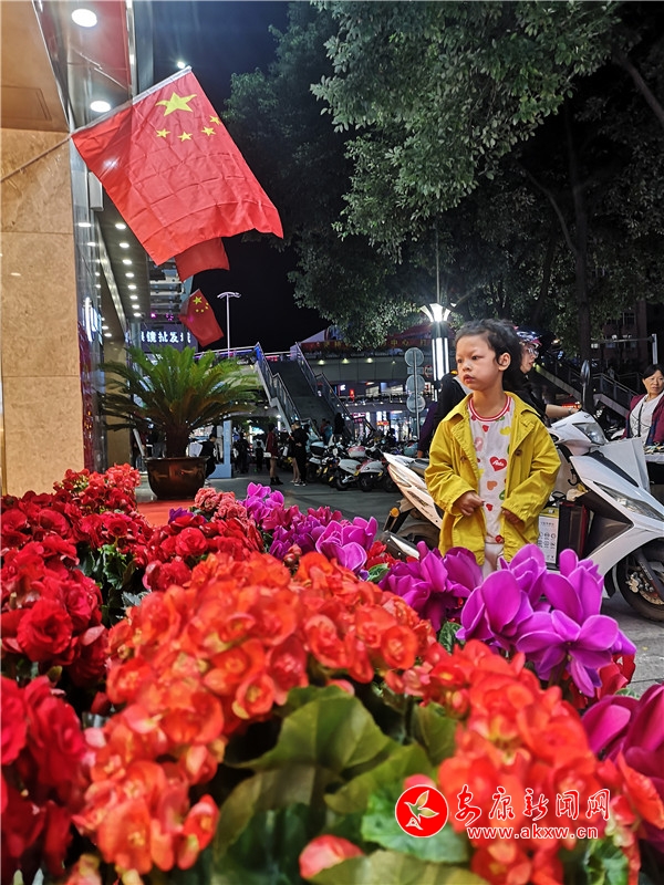 9月30日晚,兴安路金州路十字某商家用国庆和鲜花装饰店面,引得市民驻足。PBy安康新闻网