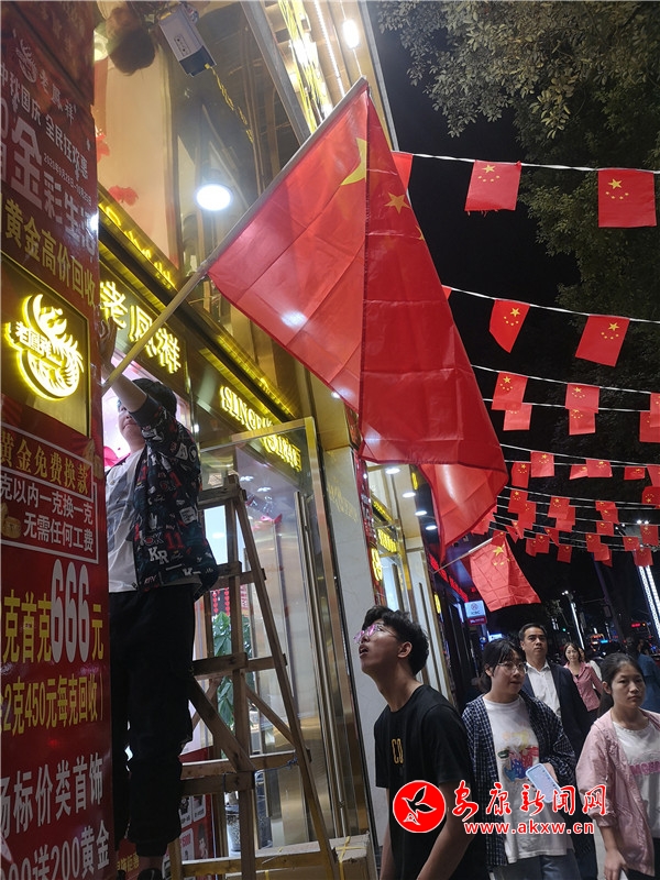 9月30日晚,金州路某商家正在为店面挂国旗。PBy安康新闻网